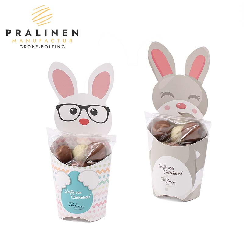 Eine kleine Auswahl an köstlichen alkoholfreien Pralinen in einer schönen Oster-Verpackung in Hasengestalt. Zur Wahl stehen Ihnen hier Hannelore Mümmel und Horst Hoppel.
