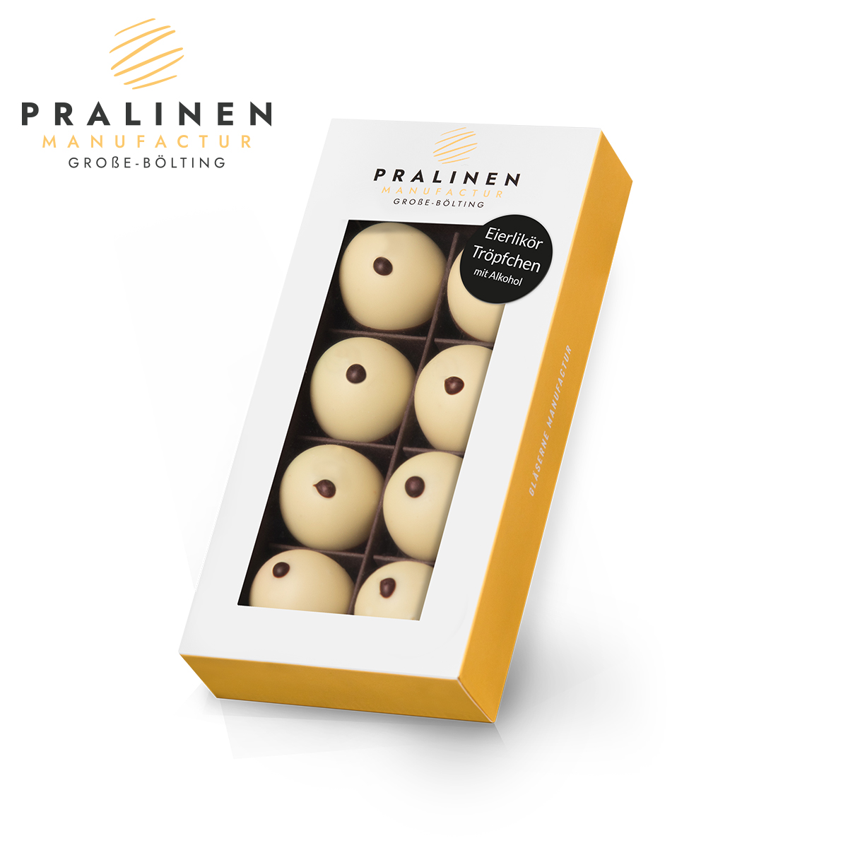 Diese zarte Premium Praline ist für Eierlikör-Liebhaber. Die Eierlikör Praline beinhaltet halbflüssige Trüffel aus weißer Schokolade mit cremigem Eierlikör und frischer Sahne.