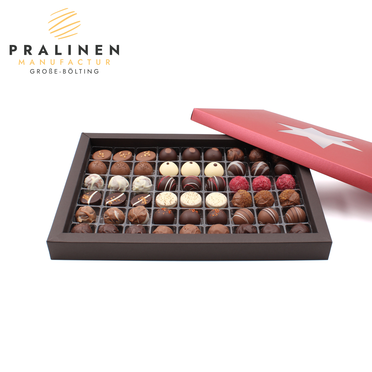 Unsere große Pralinenschachtel mit 54 Pralinen ist ein wahres Fest. Für die ganze Familie zu Weihnachten oder als Pralinen Weihnachtsgeschenk für Schokoladenliebhaber. Diese Xxl Pralinenschachtel ist nicht nur mit edlen Pralinen gefüllt, sie sieht auch noch toll aus. Zwei Festtags-Auslese Pralinenschachteln haben wir für Sie kreiert: In Rot mit einem Stern und in Champagner mit dem Schriftzug „Frohes Fest“. Jeweils mit und ohne Alkohol.