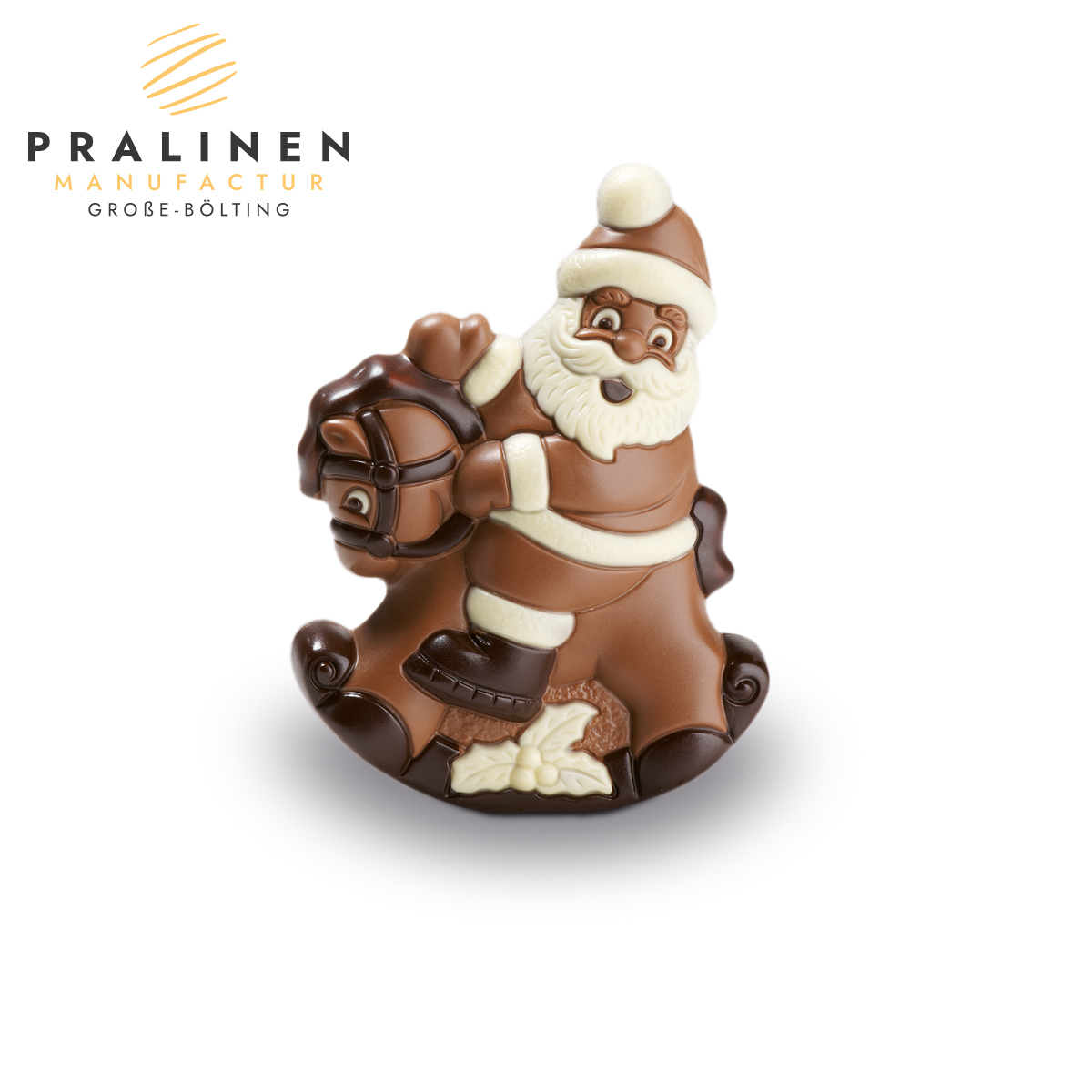 Dieser kleine Schokoladen Weihnachtsmann auf einer Schaukel ist 16,5 cm groß und 250g schwer. Er ist handgemalt und besteht aus Vollmilchschokolade, dekoriert mit weißer Schokolade und Bitterschokolade.
